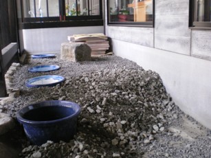 石積みが極まったそばから植木鉢を置き、砕石を搬入、地盤を作っていきます。植木鉢の位置には事前にチョークで印を付けていました。初めから設置していると、何しろ場所が狭いので石積みが出来ないのです。店は5時には開店、お客さんが入るので、迷惑にならないように時間に合わせて仕舞わなければなりません。玄関前なので、安全と美観のためにも散らかしっぱなしにはしておけない。トラックを駐車したまま仕事できればいいのですが、ここは幅員も無く、しかも駐車禁止。毎日散乱した石をかたずけては車に積み込み、また翌日降ろすという作業が4日続きました。これが無ければかなり仕事もはかどるのですが、幸い、工期の締め切りは無いので、新装開店に間に合わせてやる突貫工事に比べたら幸せです。