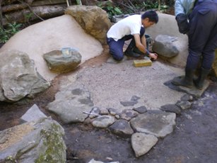 用意した土が足りなくなってしまいました。苦肉の策、残り部分は別の土でやることに。土の色に合わせたゴロタで、先に要所に配石していきます。